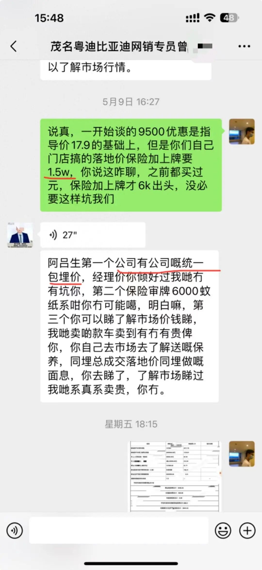 吕先生介绍,今年5月8日,他购买了一辆2024款比亚迪唐DM-i荣耀版112KM尊贵型汽车,裸车价格为179800元,在与销售人员协商优惠9500元后,吕先生买下了这台车。然而,他却发现,自己签订的购车合同上显示包牌售价为188300元,“这意味着汽车落地价比裸车价多出了18000元”。